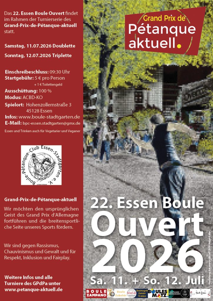 | 12.07.2026 | 22. Essen Boule Ouvert | Boule-Pétanque-Club Essen-Stadtgarten | 3:3 | EBO3 |